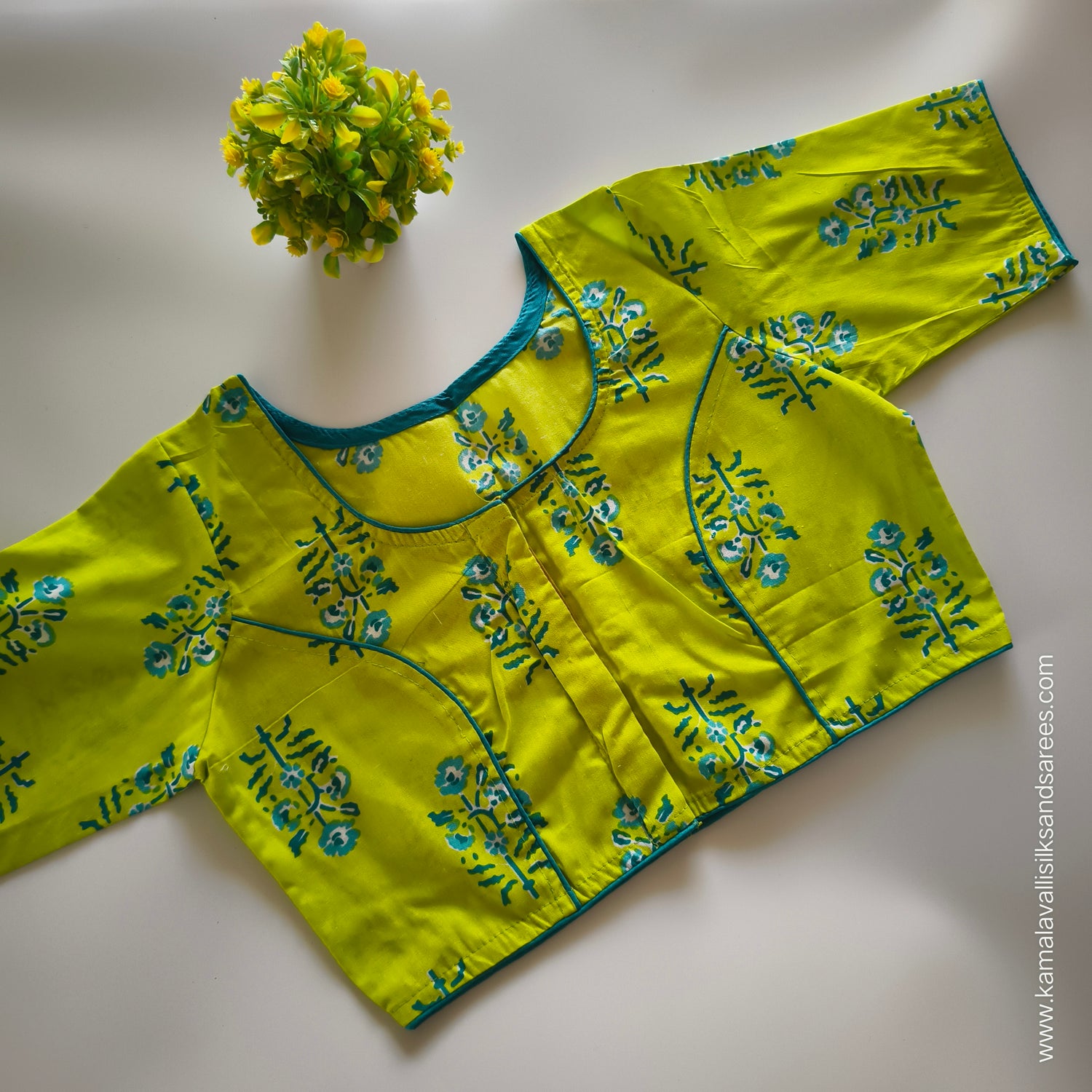 South Cotton Mix Block Printed Saree Teal colour with Royal Blue colour contrast blouse
